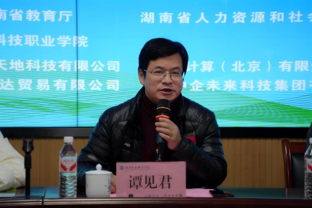 谭见君在致辞中向各位领导、嘉宾、师生表示诚挚欢迎,并介绍了学校近年来的发展成效。他指出,作为湖南省唯一获批国家示范性软件职业技术学院的高职院校,学校始终紧扣“三高四新”战略,积极构建“AI+”专业体系,深化产教融合,在软件技术、区块链、信息安全等领域积累了扎实的办学基础与实训条件,为本次大赛的顺利举办提供了有力保障。