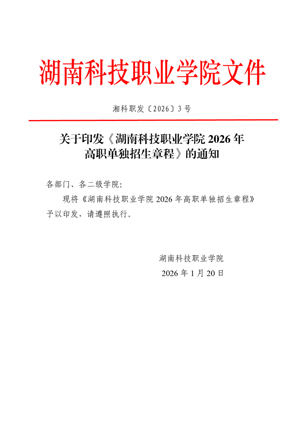 关于印发《wb万搏体育·(中国)平台官方网站2026年高职单独招生章程》的通知
